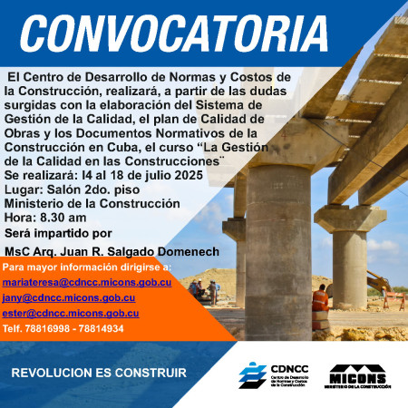 El Centro de Desarrollo de Normas y Costos de la Construcción los convoca a participar en el Curso «La Gestión de la Calidad en las Construcciones», con su sede habitual en el Ministerio de la Construcción del 14 al 18 de julio del presente año. !Aún estas a tiempo de participar!.
